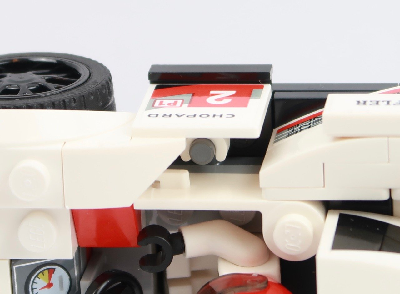 From the side, beyond what I’ve previously mentioned, it’s all lines and curves to that huge back spine and wing. The stickers for the various sponsors are excellent and give the car a nice finish. That side panel has a lot of character thanks to the choice of bricks, and captures that side groove from the real car so well.