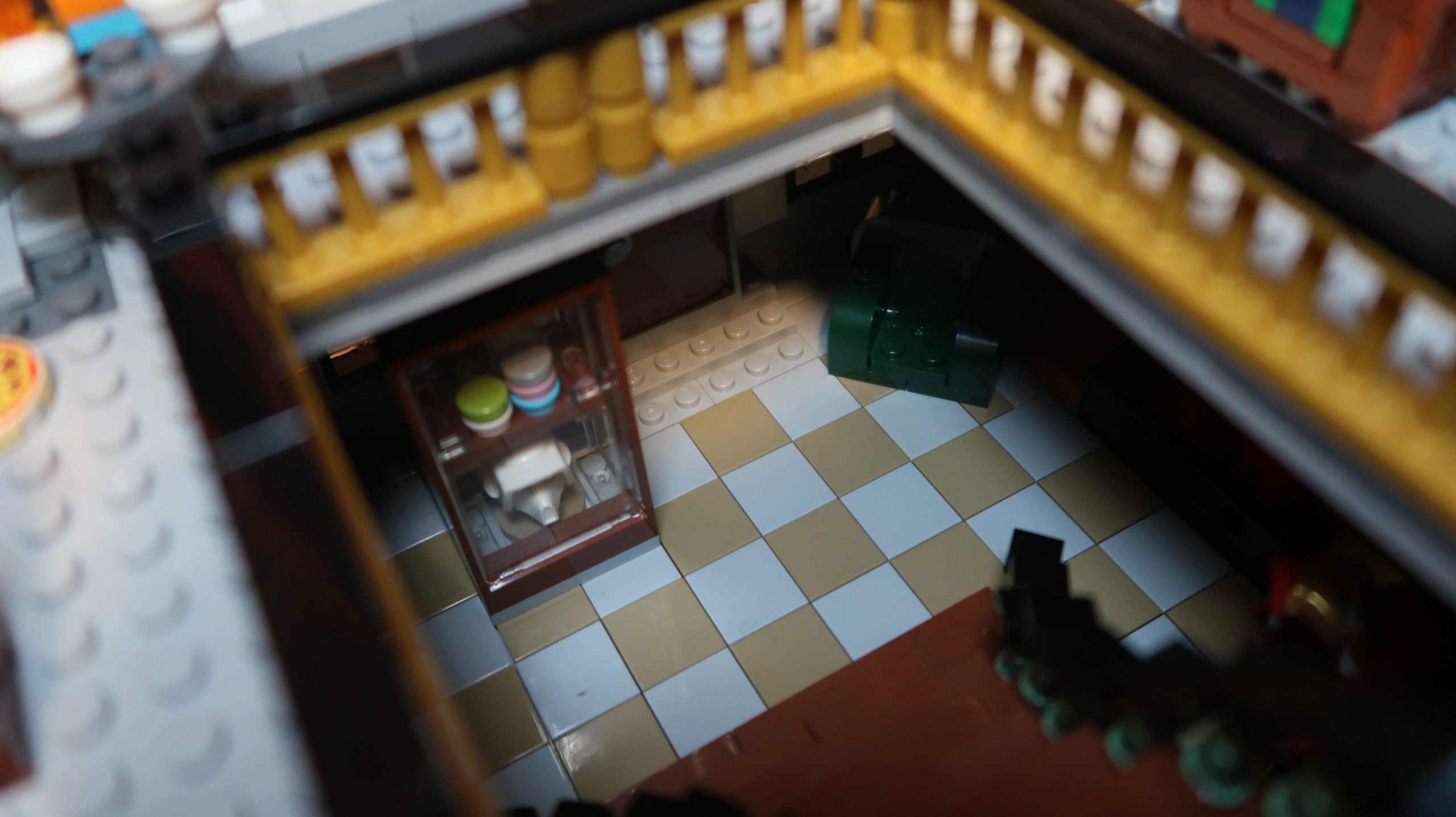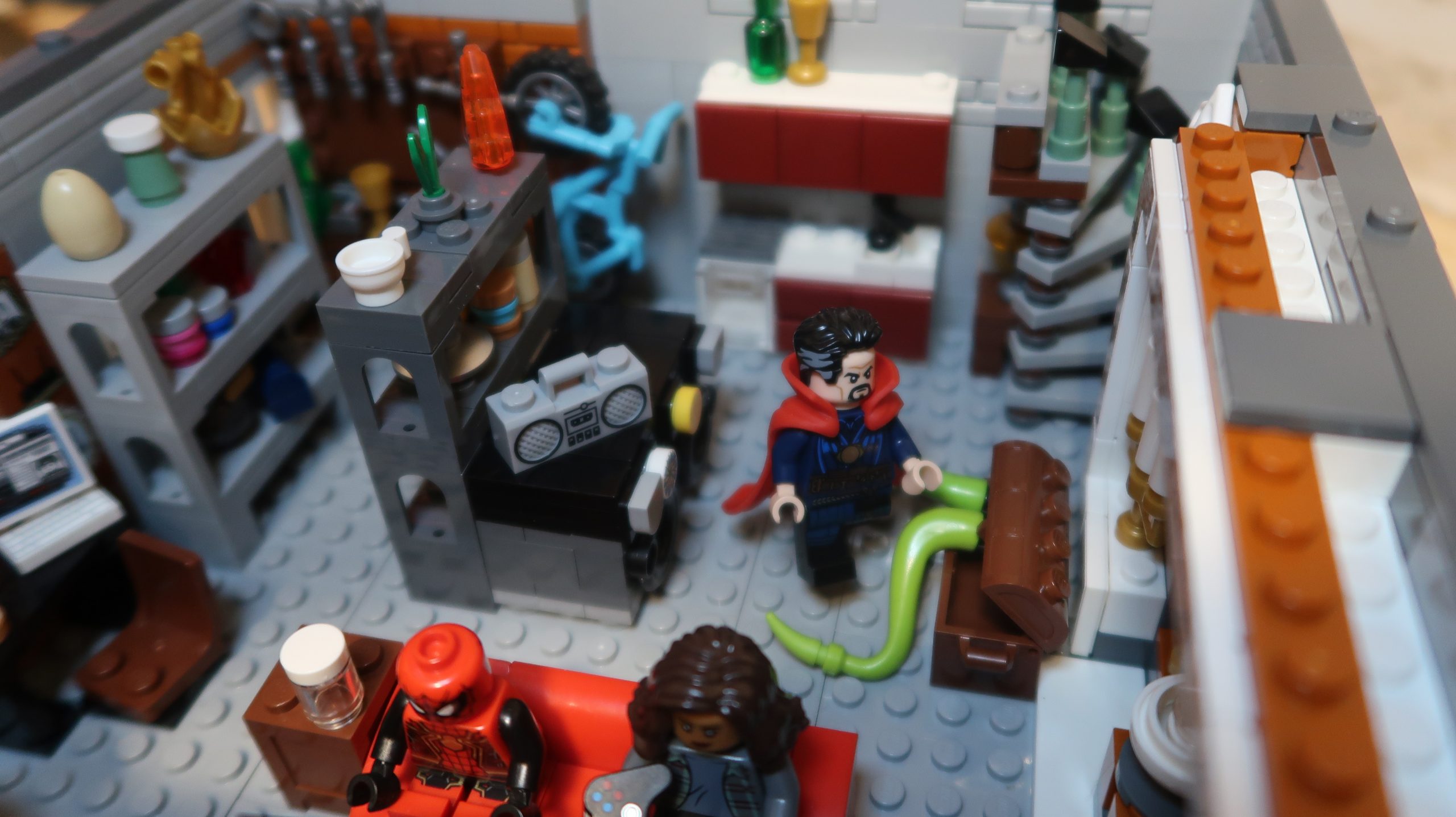 Where it gets super interesting is the 2nd floor. When the Spider-Man at the Sanctum Workshop (76185) came out I knew I wanted to include it. Unfortunately, it’s meant to be the basement – again, like the scene in the Spider-man movie. But what the heck, it’s my MOC and I wanted a really cool basement on the 2nd floor. It’s overflowing with shelves, a kitchen, washing machine, portal (from the set), workshop and more… Seriously, it took me days to finish that floor!