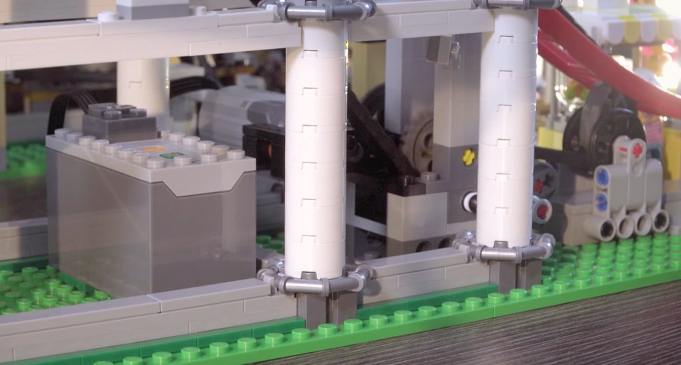 What is interesting is how many mechanisms they’ve included to propel the cars around the track. You can see in the previous shots, the main chain system for getting the cars up to the top. But what is almost as impressive is the push along functionality at the loading area and on the top section.