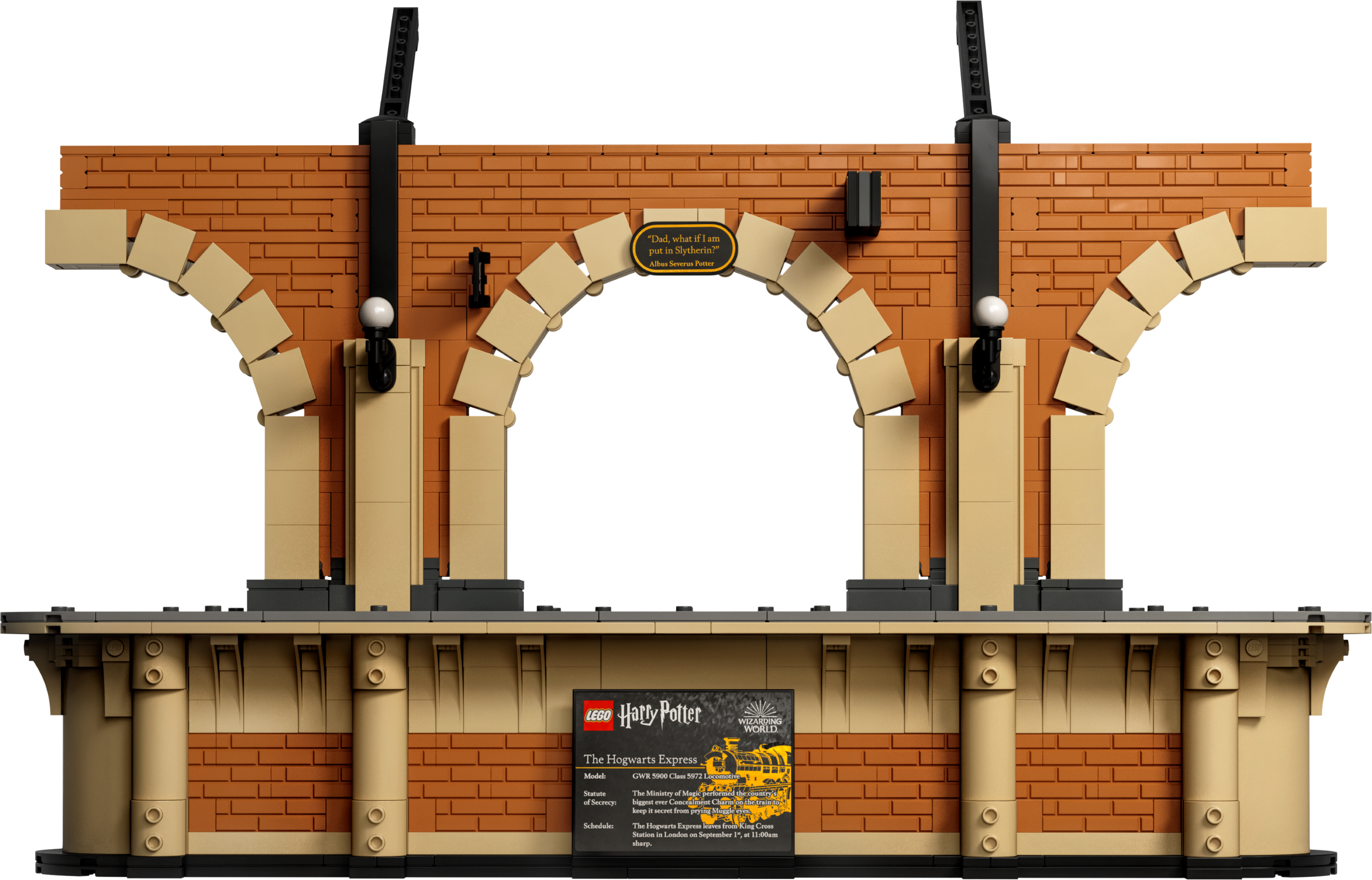 The engine features a detailed underside and a lever on the top that causes the train to rock with the motion of a steam train. A tender carries the engine’s supply of coal. The passenger carriage comprises 3 compartments, each depicting a classic scene: when Harry, Ron and Hermione meet in the series’ first film; when Professor Lupin saves Harry from the Dementor™ in the third film; and when Luna saves Harry from Draco’s spell in the sixth film. The model also depicts Platform 9¾ at King’s Cross Station, where the adult Harry and Ginny wait with their children, Lily, James and Albus, ready for Albus’s first trip aboard the amazing Hogwarts Express.