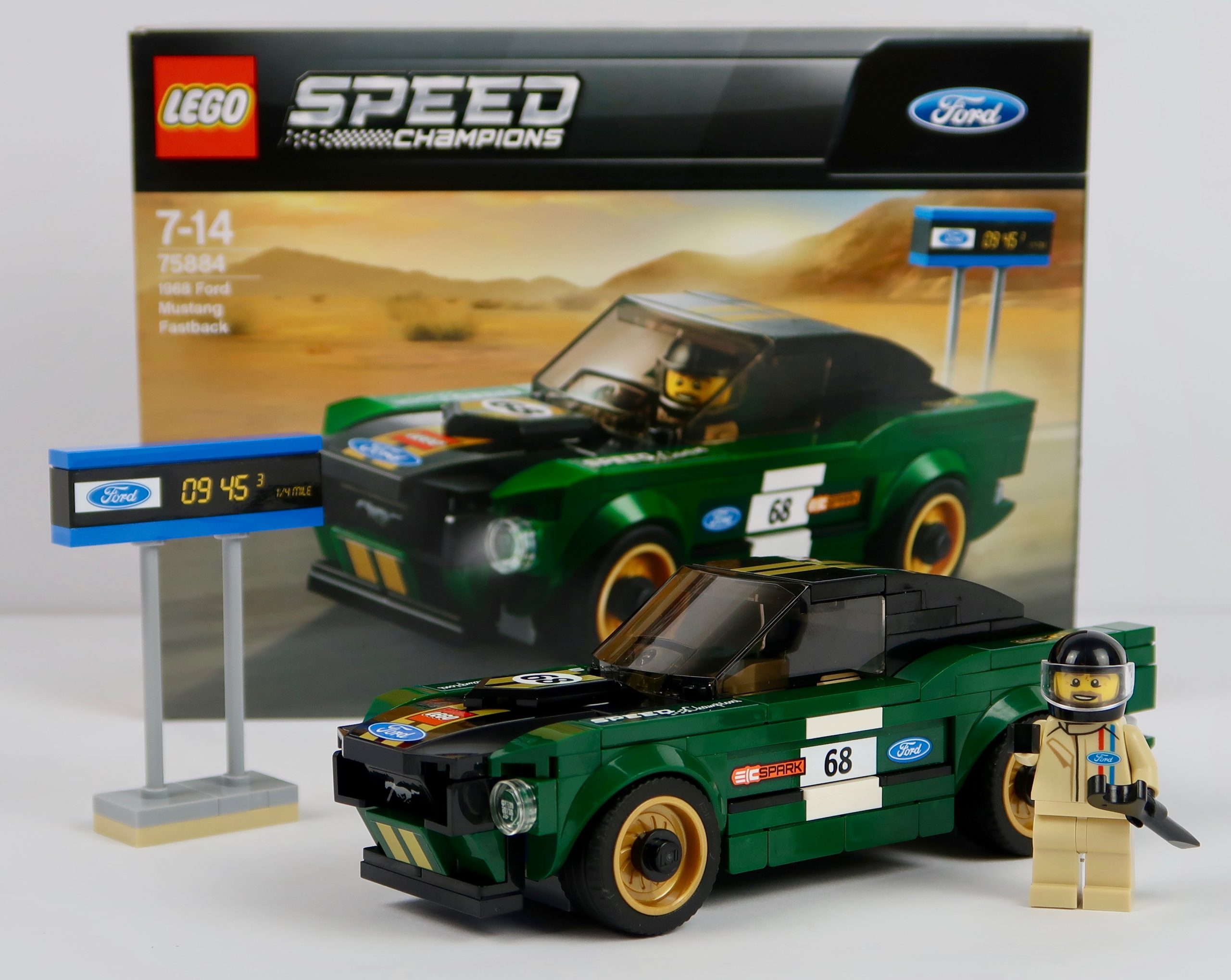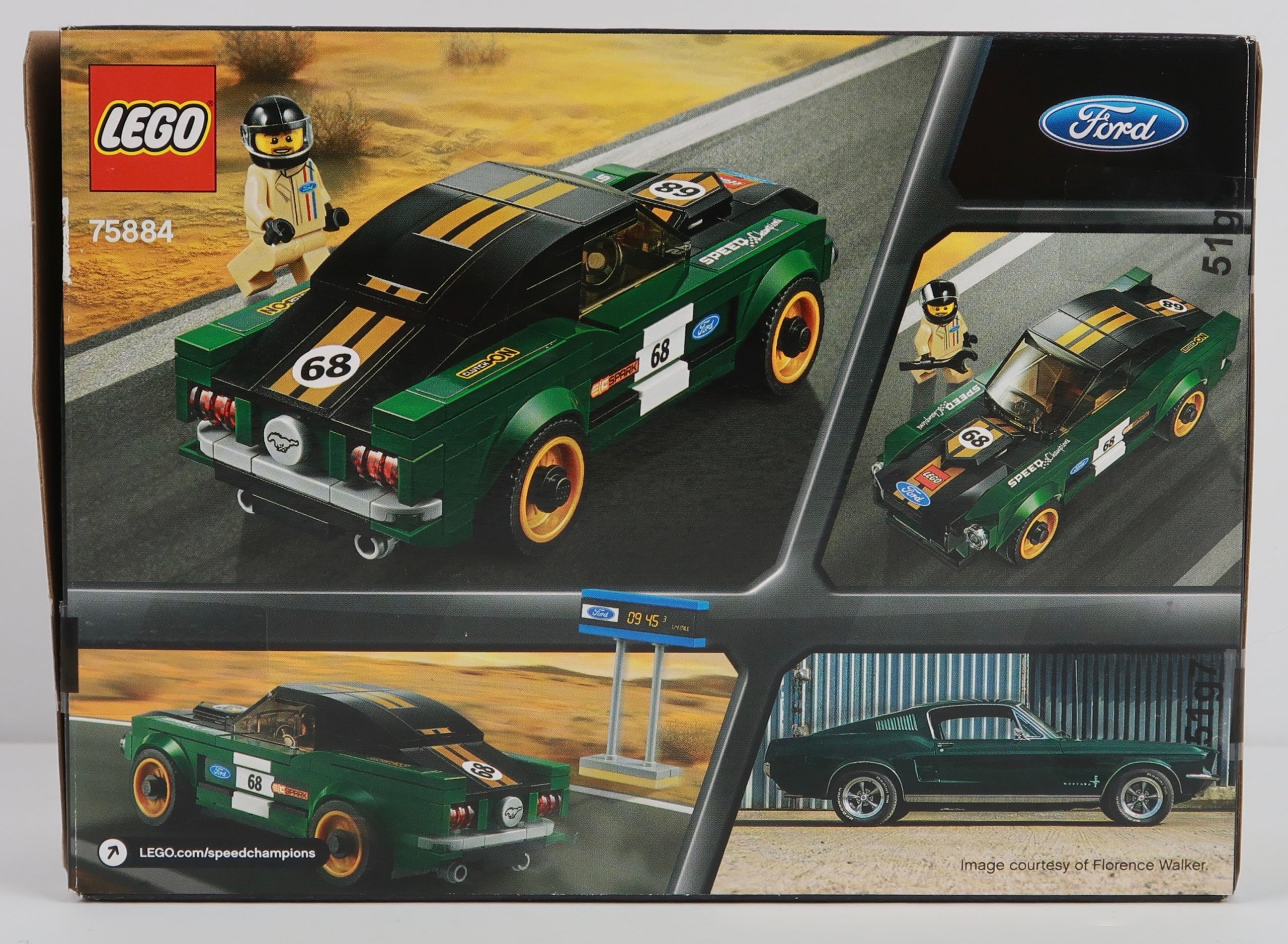 Moving to the back and the other shots show the car resting and what looks to be re-tuned for another epic run. The mini-figure as you can see is in the class overalls and has the standard spanner. In the bottom right, is a beautiful green Ford Fastback Mustang from 1968. A stunning, stunning car and a personal favourite in my family. One thing I would have like to see on the box art is the actual Mustang brand logo. This is a Ford car, but I think the Mustang Logo should have been featured with the car on the back.