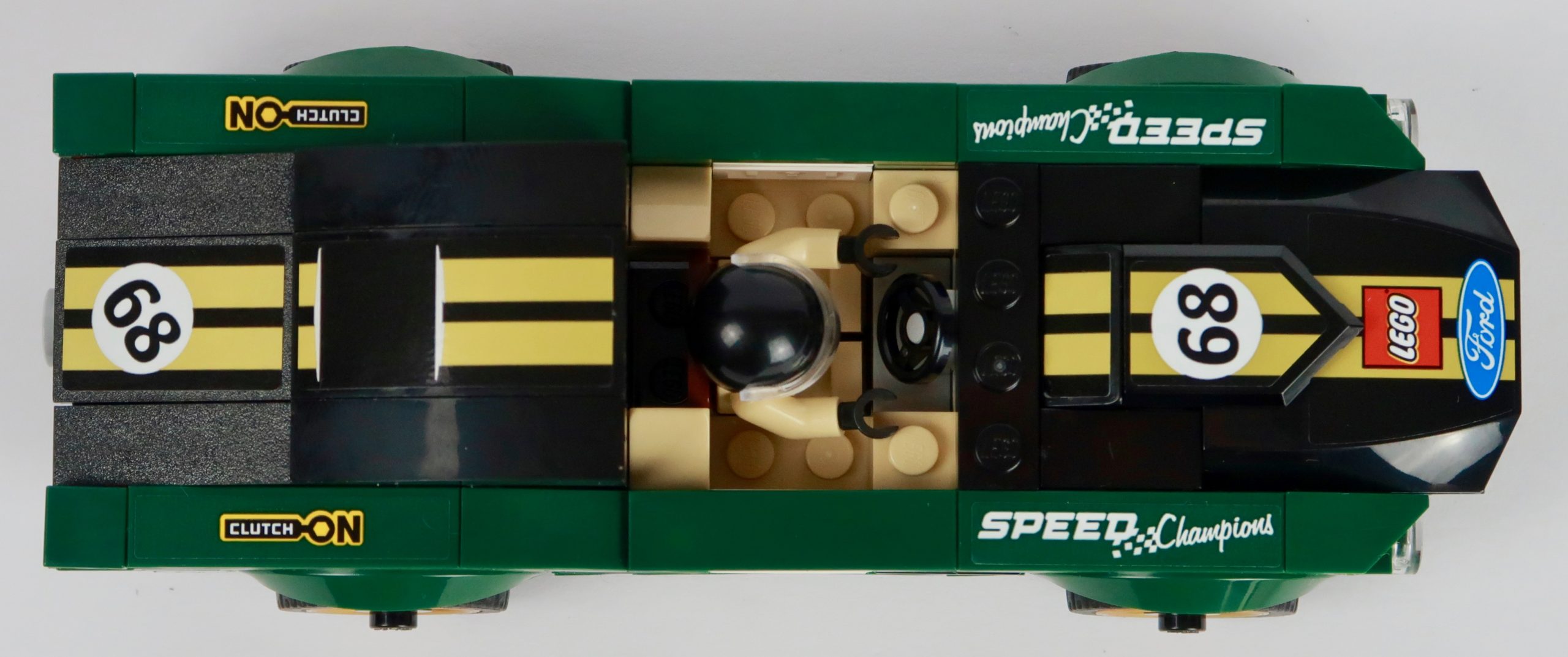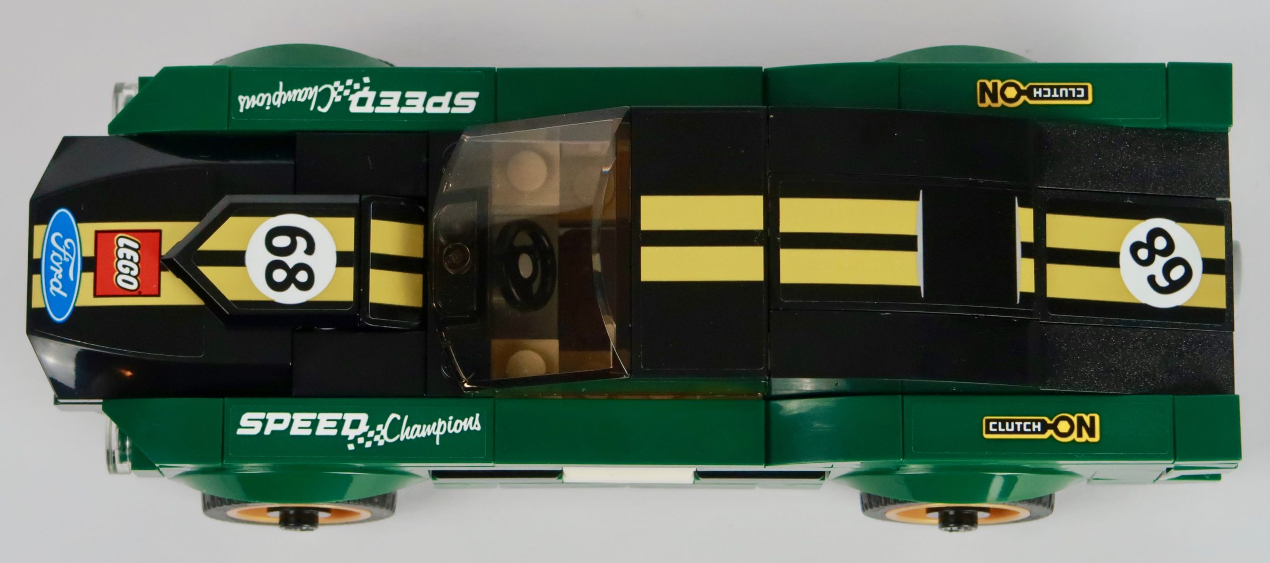 Looking at the side profile it just has all the right angles. I especially like the way they used two 1×2 smooth white blocks and an 1x1x2 white angled plate to complement the side door stickers, showing the sponsor and Ford livery. The bonnet and front has that pointing stallion angle being pushed forward by the huge engine and air scoop pulling the car forward. The classic gold wheels with single round studs finish rolling stick off. Moving to the back, the roof slopes down beautifully towards the rear. I perhaps would have like to see the roof being smoother but that really is just being picky. And in this photos, I love the way the exhausts sit nicely behind that rear wheel, just poking out from behind that final upward curve.