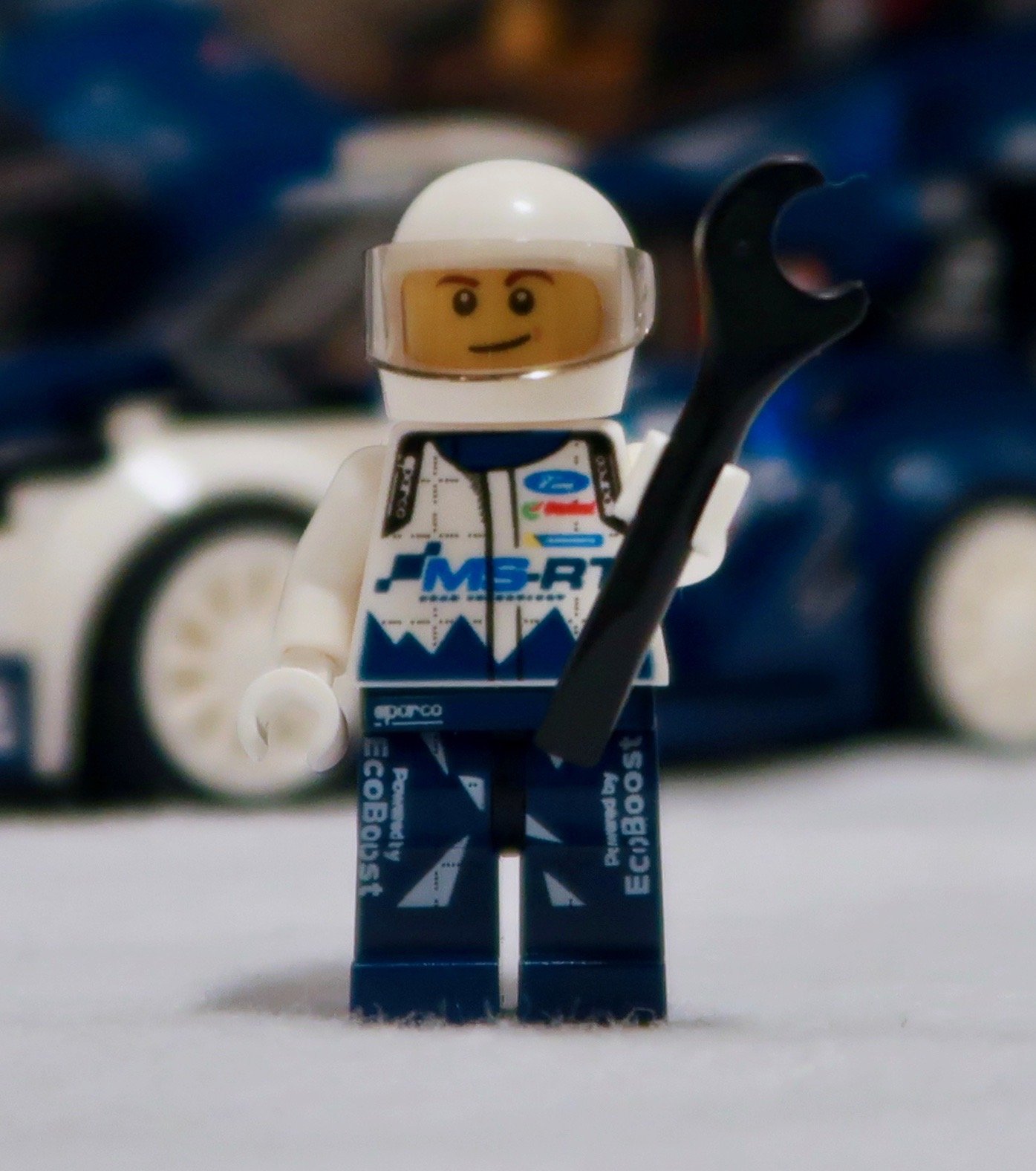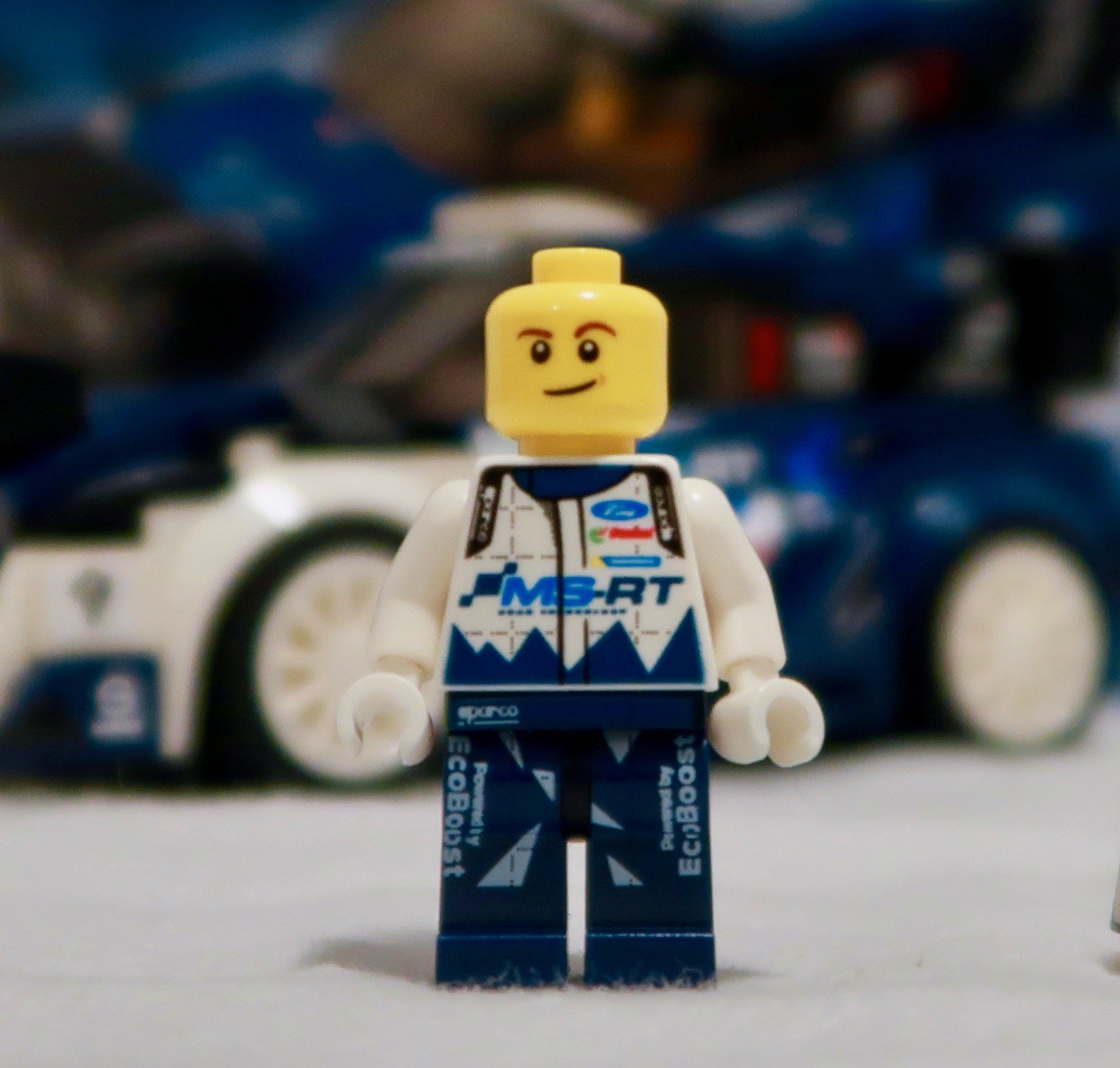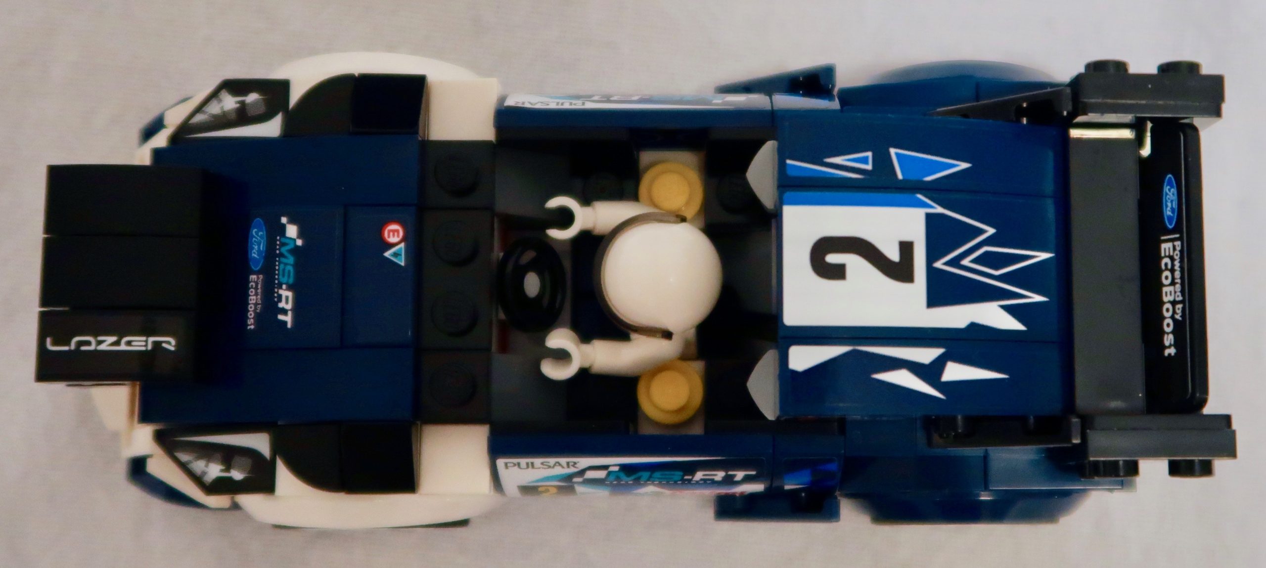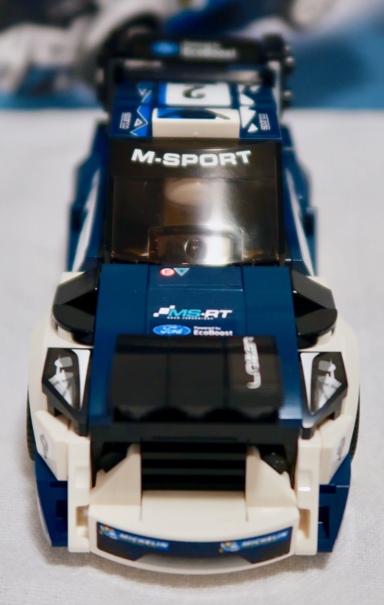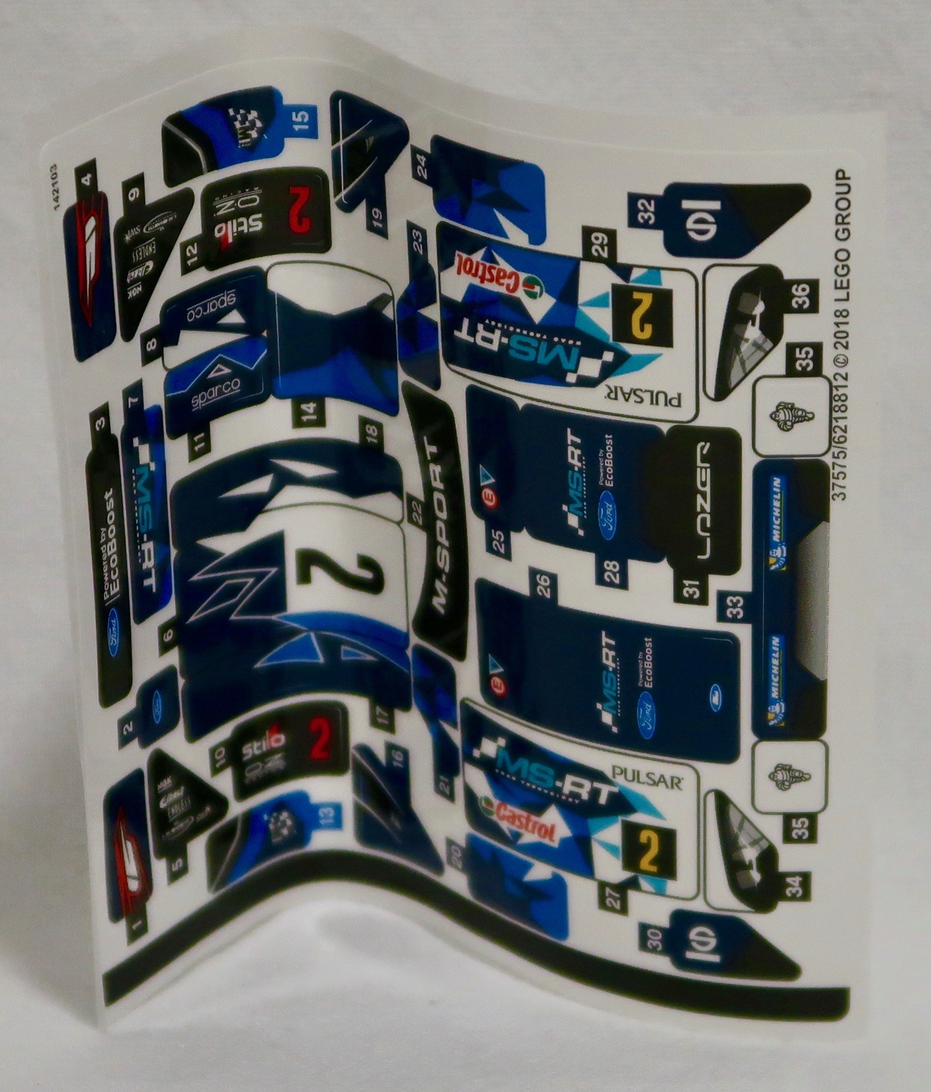 The sticker sheet – which I’ve tried to flatten out – is extremely well printed. This is one well-sponsored car! Featuring among other logos for Sparco (racing accessories), Castrol Oil and Pulsar Watches. Ford’s own EcoBoost brand is also featured a few times. Given the size of the stickers, the level of detail is very good. And as for the count, 36 stickers for a car that sponsored is not unreasonable. Although I, like so many older builders, miss the days of the printed bricks. At least the major ones like the bonnet, roof, wing and doors.