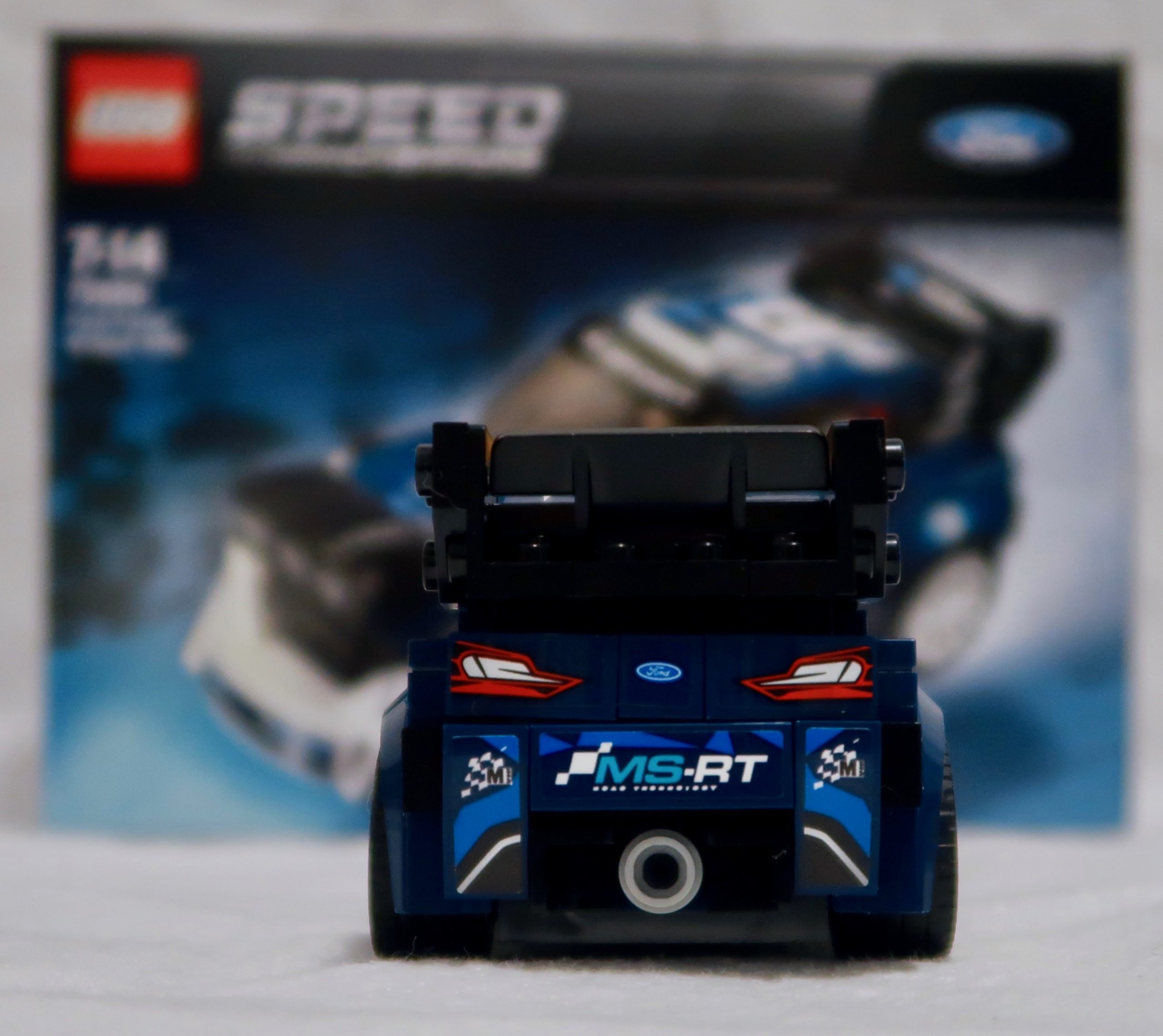 The packaging is as good as the LEGO Ferrari 488 GT3 “Scuderia Corsa” 75886, using the same race inspired packaging with the LEGO Speed Champions logo. In the corner, we have the iconic Blue Oval Logo of Ford. The main image of the car shows the Ford Fiesta in a classic rally pose, powering through/above the snow.